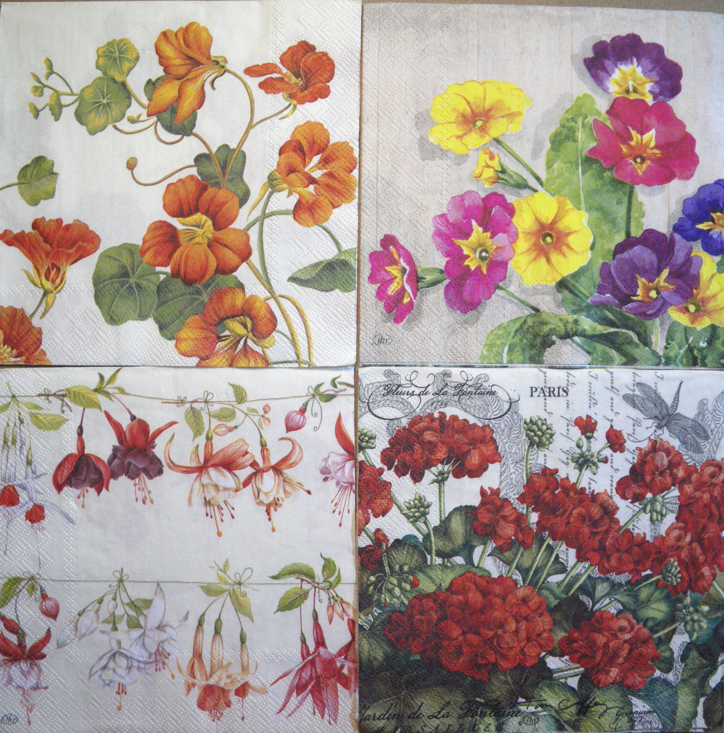 Set de 4 servetele care pot fi folosite pentru decorarea obiectelor din lemn, carton, sticla, ceramica, textile, etc., folosind tehnica servetelului.